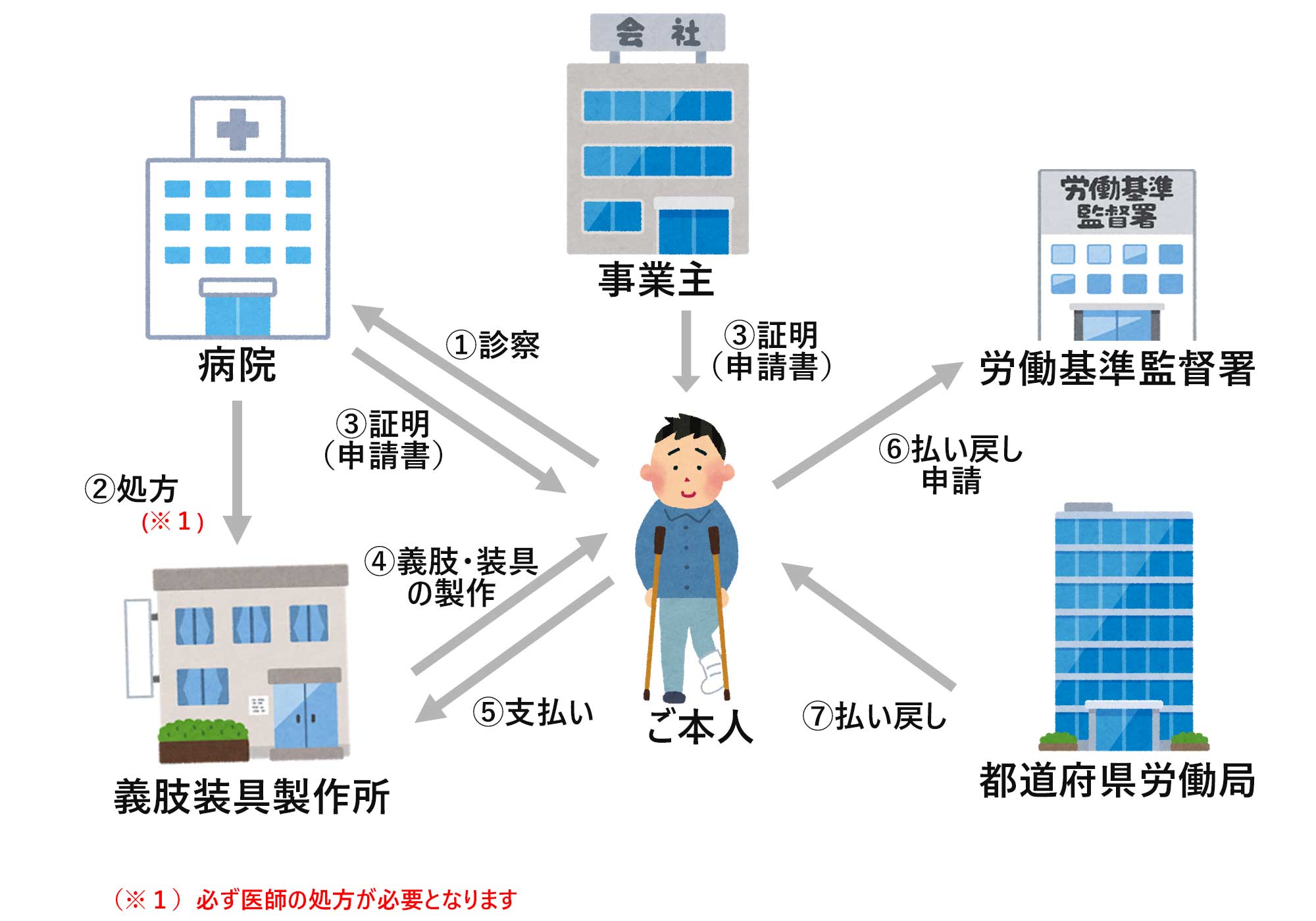 凡例: =医師 =患者様 =製作所 =労働局